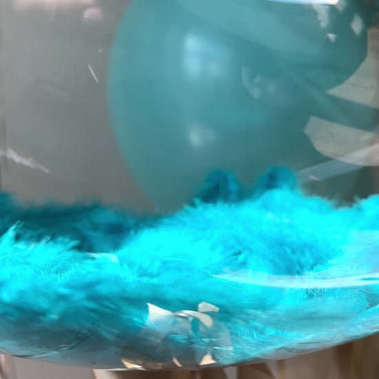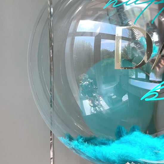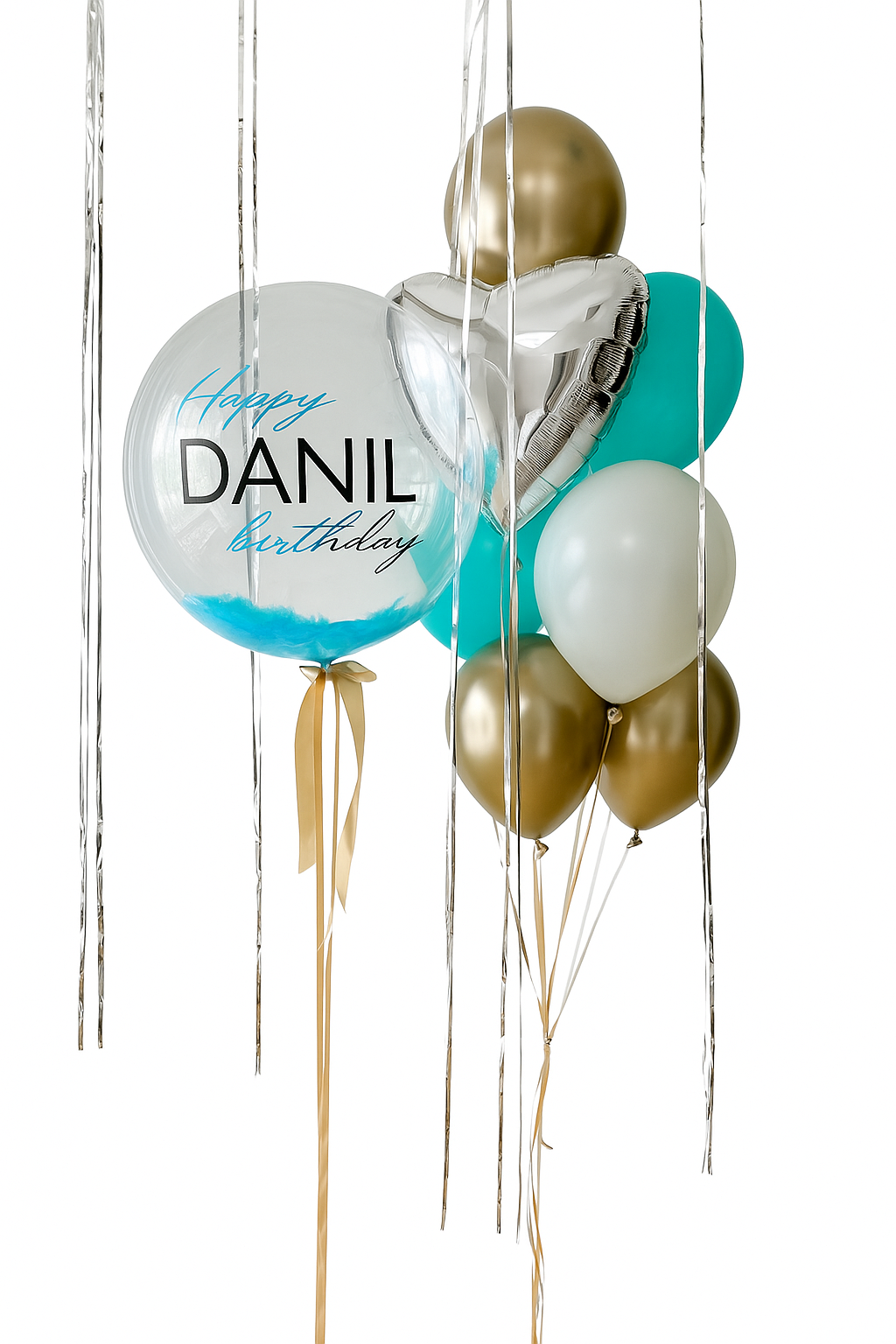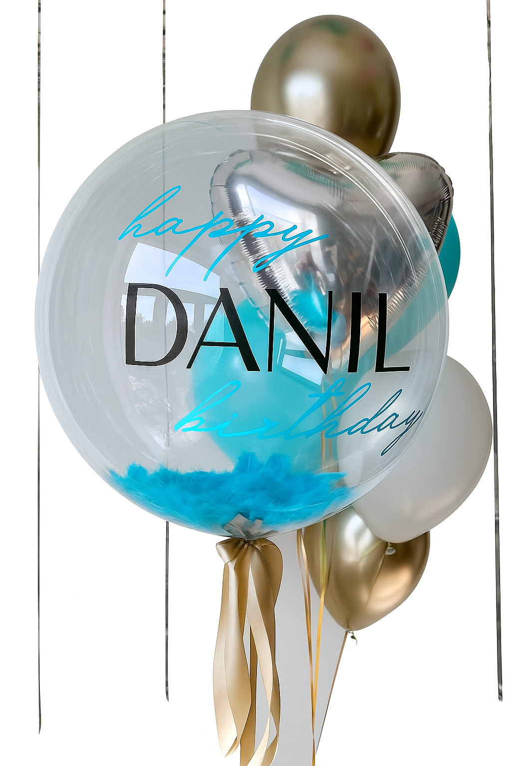 One custom bubble balloon with aqua feathers and a personalized message (e.g., Happy Birthday Danil)