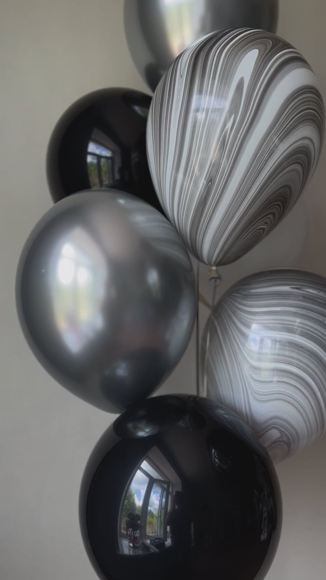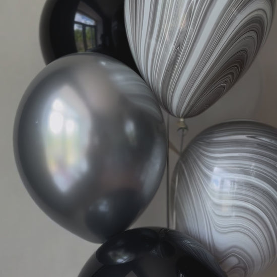 Matte black, chrome silver, and white balloons
