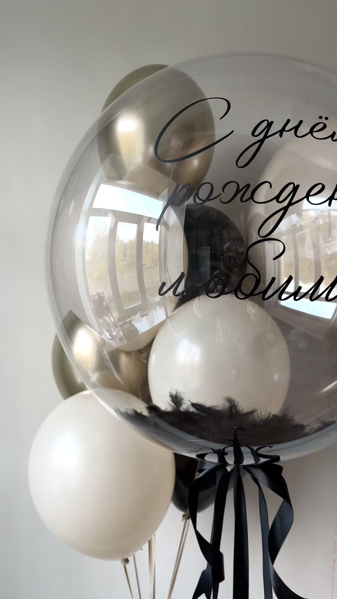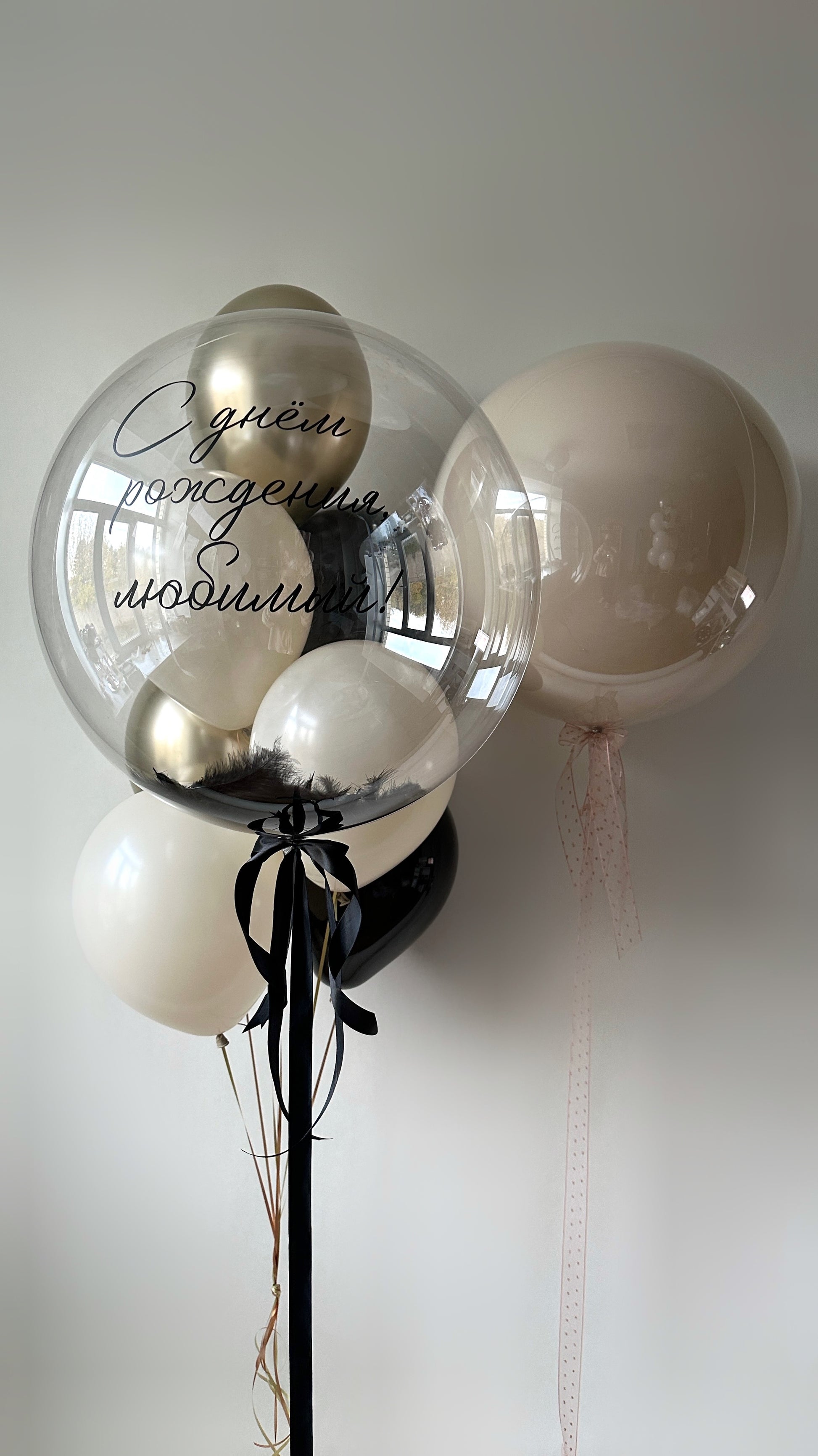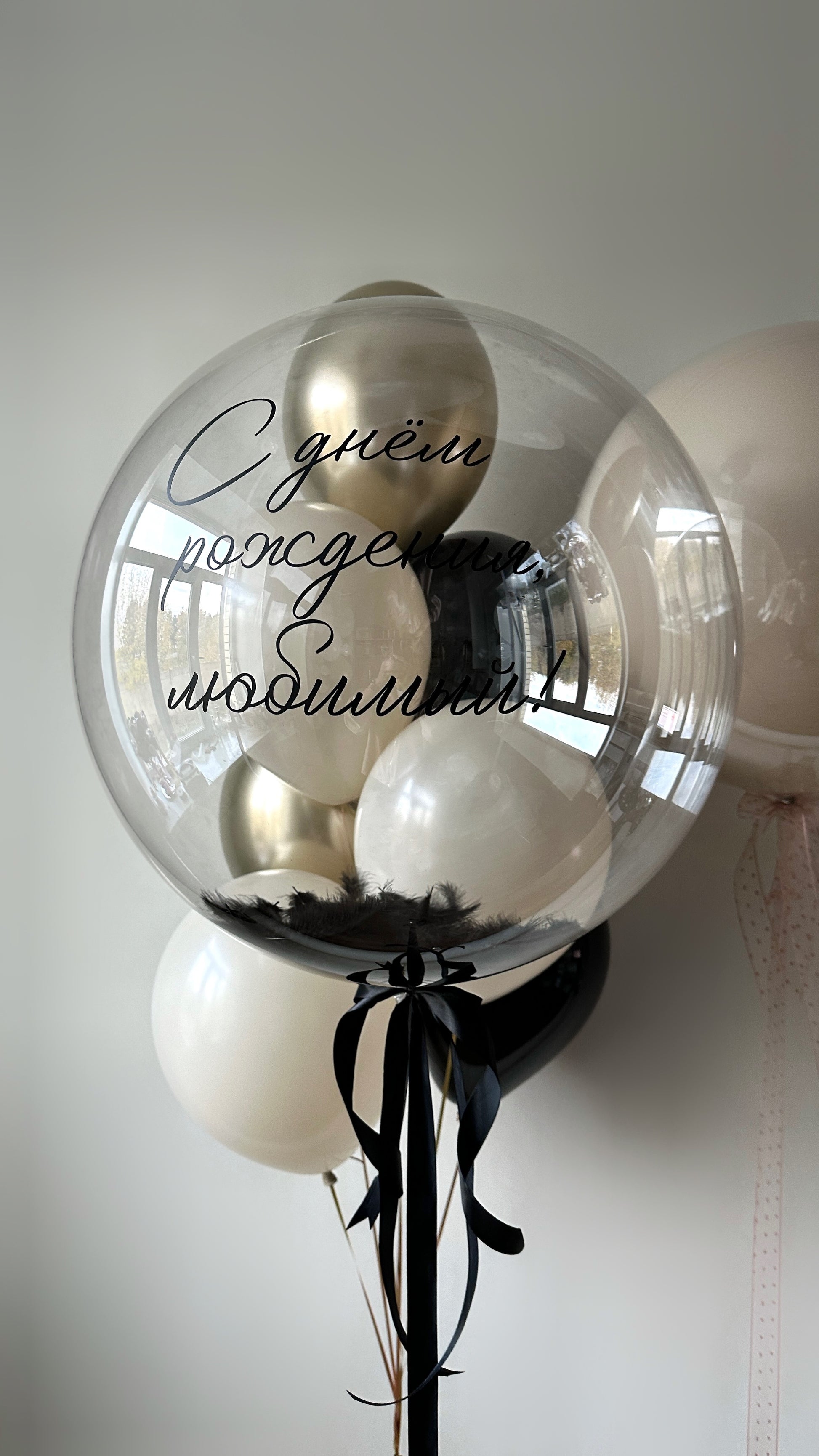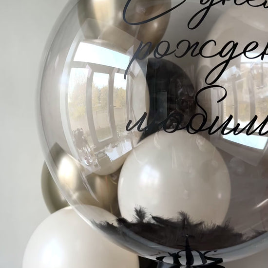 1 large transparent bubble balloon filled with gold, white, and black mini balloons, decorated with feathers and a message