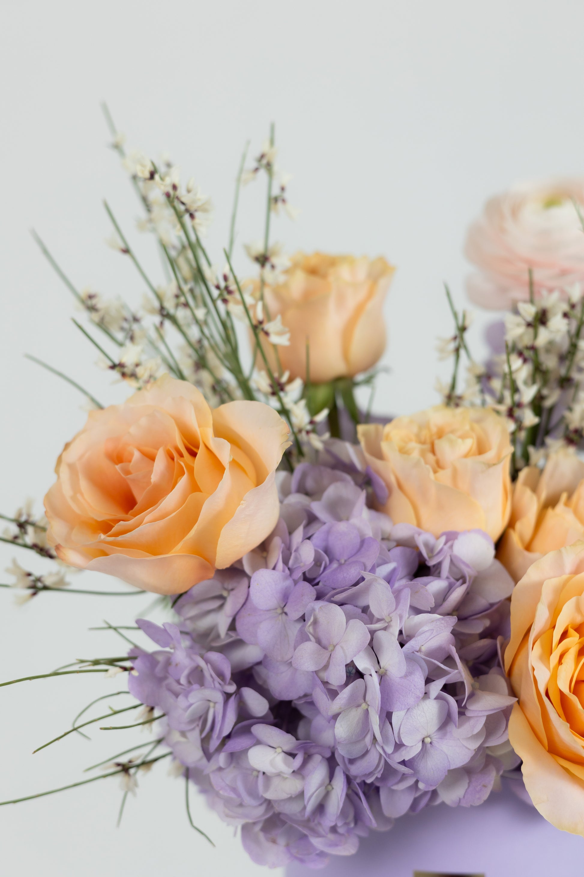 An enchanting blend of purple hydrangeas, Princess Crown roses, and delicate ranunculus. A perfect bouquet to celebrate beauty, elegance, and grace.