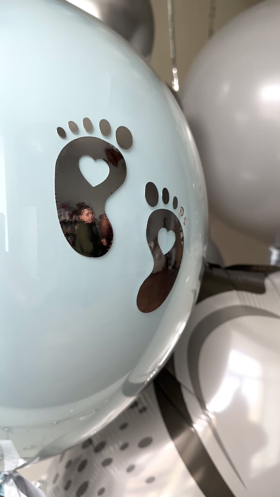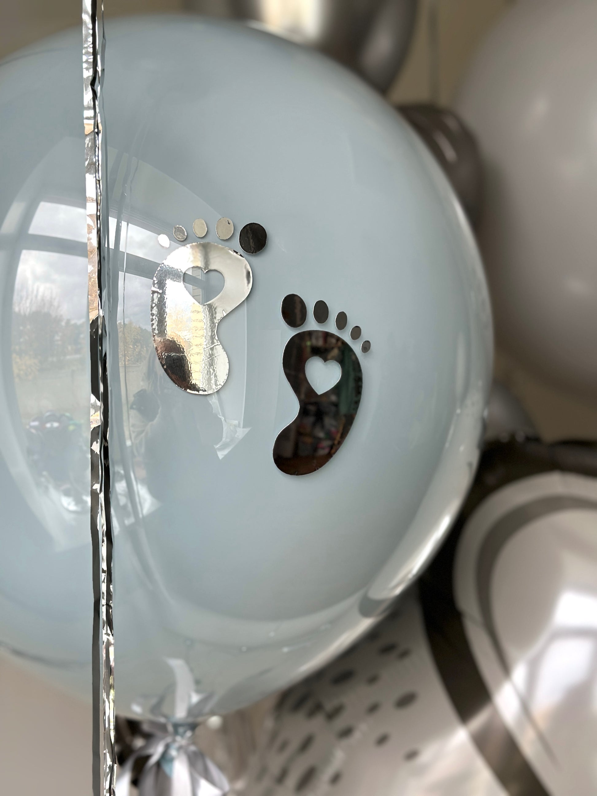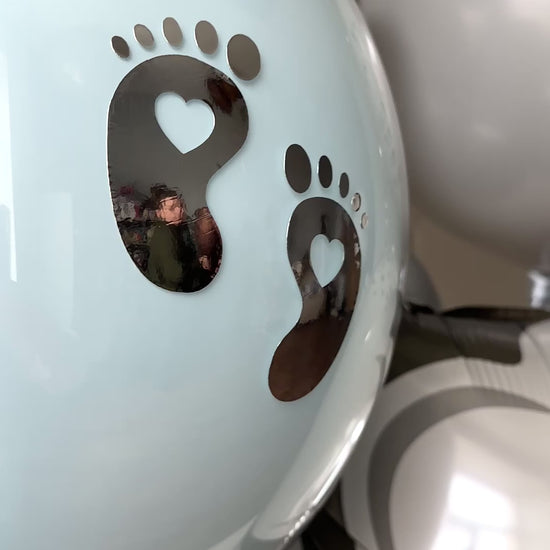 – 1 blue bubble balloon with tiny foot decals