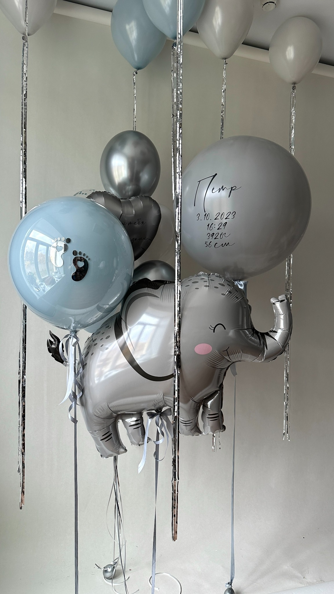 Welcome your little prince with this adorable elephant-themed balloon arrangement in gentle silver and blue tones. Perfect for hospital discharge, baby shower, or first photo session.