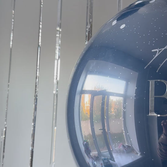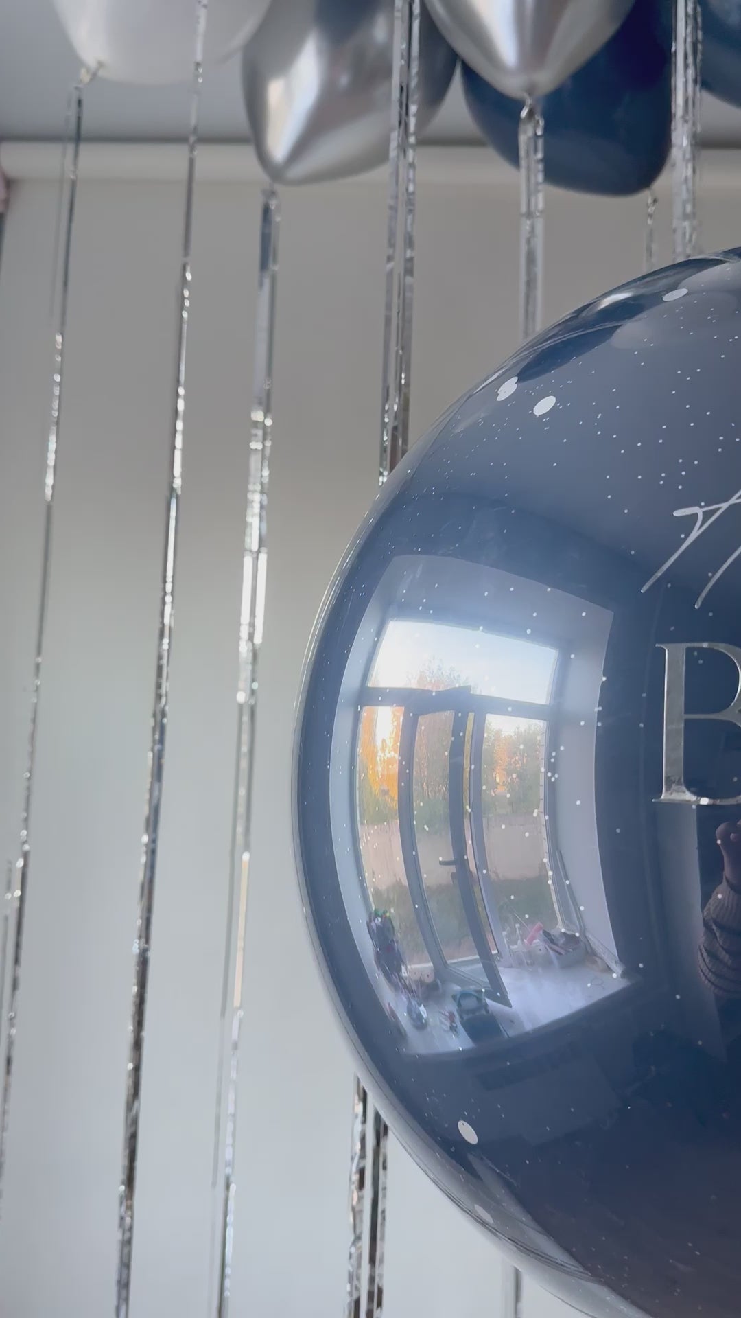 A floating ceiling bouquet of navy blue, chrome silver, and white latex balloons
