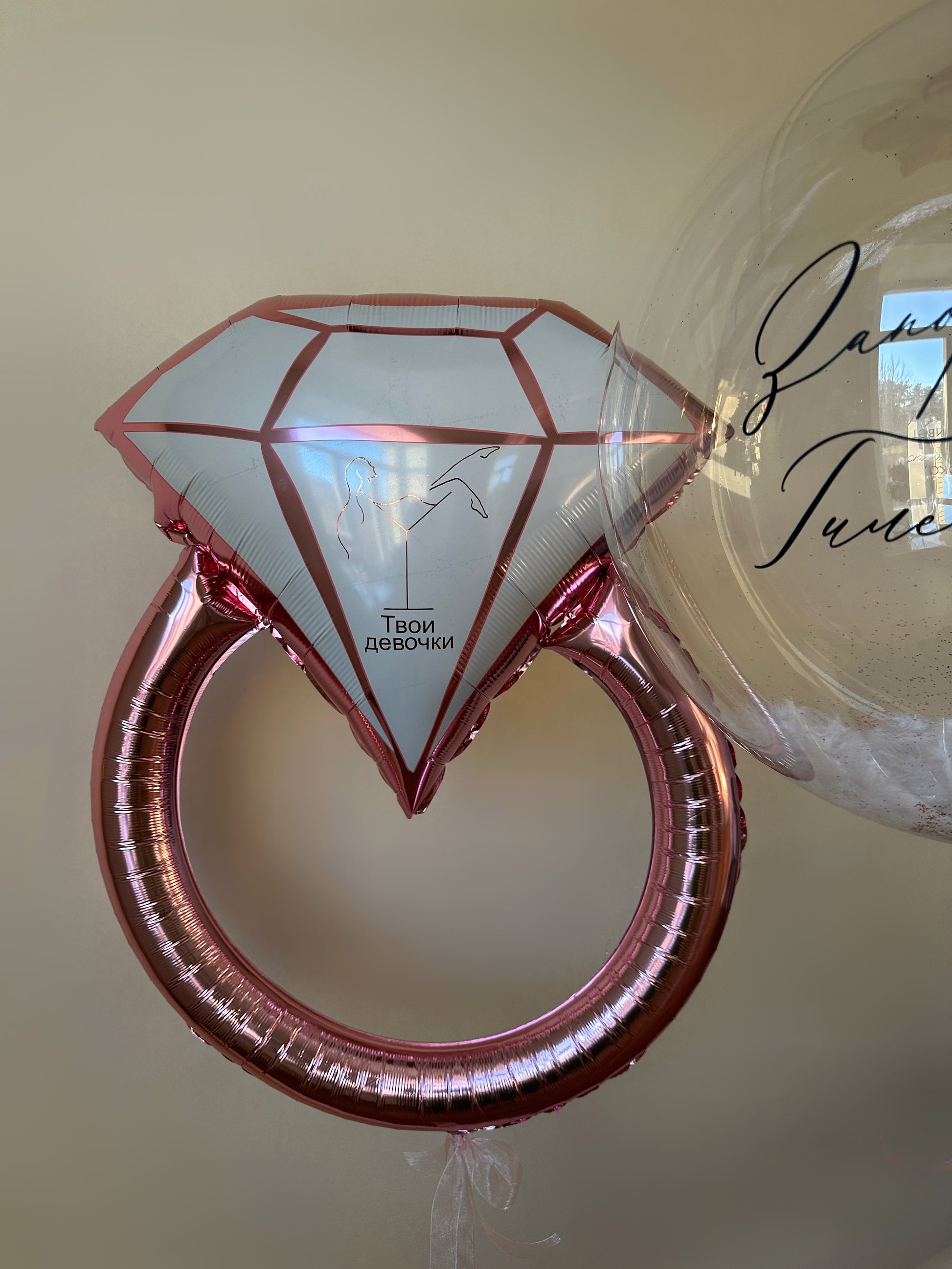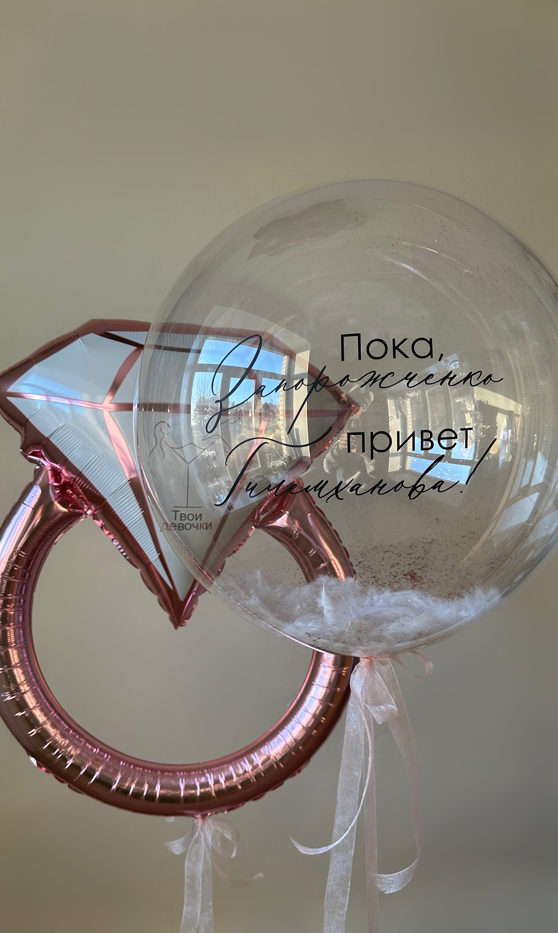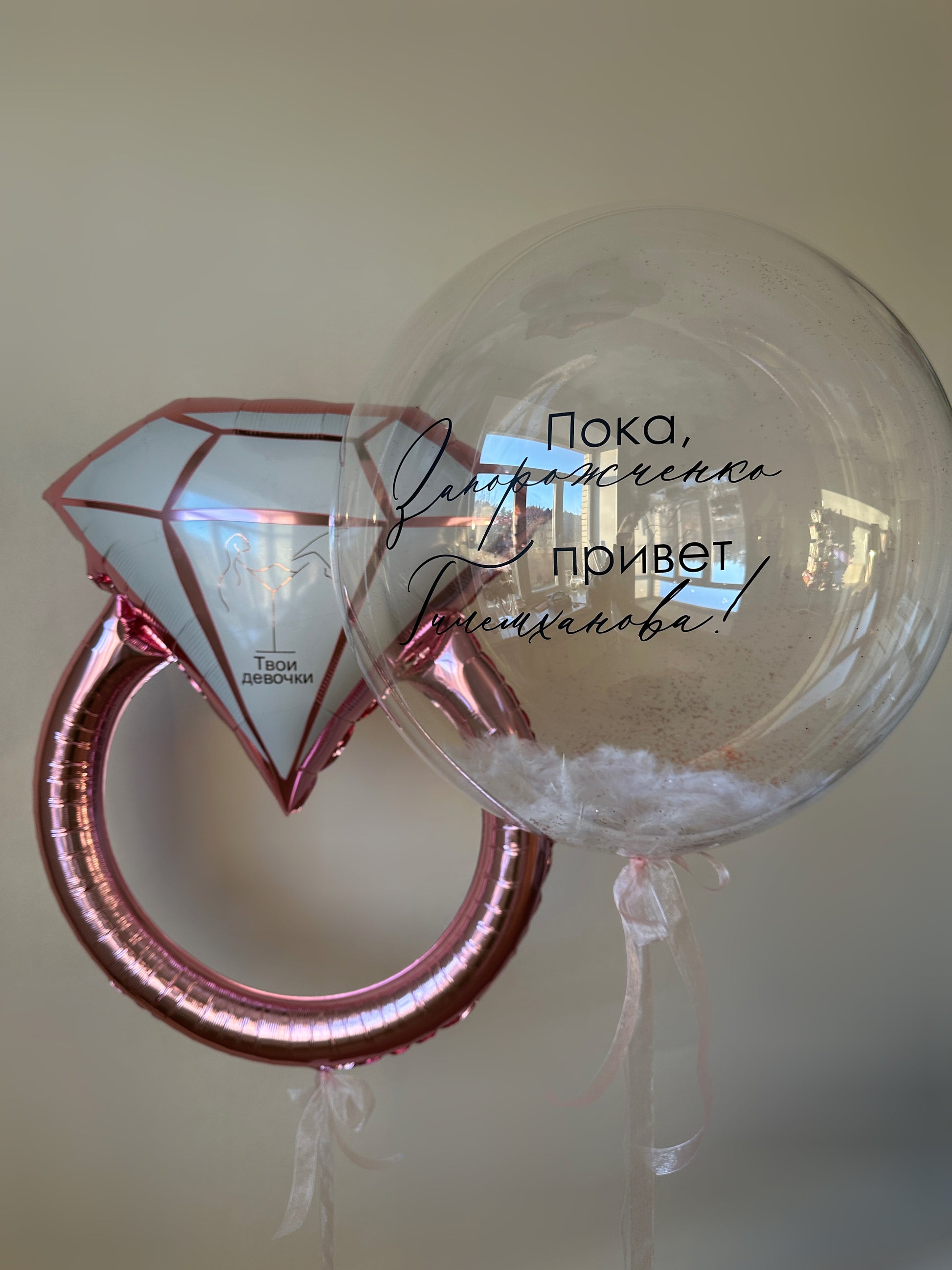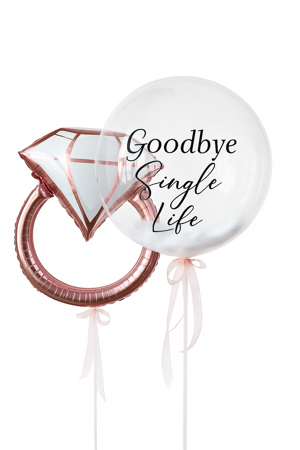 A perfect balloon set for celebrating the bride-to-be! This charming duo includes a transparent bubble balloon with white feathers and a personalized inscription, paired with a metallic diamond ring balloon. Elegant, festive, and fun — ideal for bridal showers, bachelorette parties, or surprise celebrations. Custom texts available upon request.