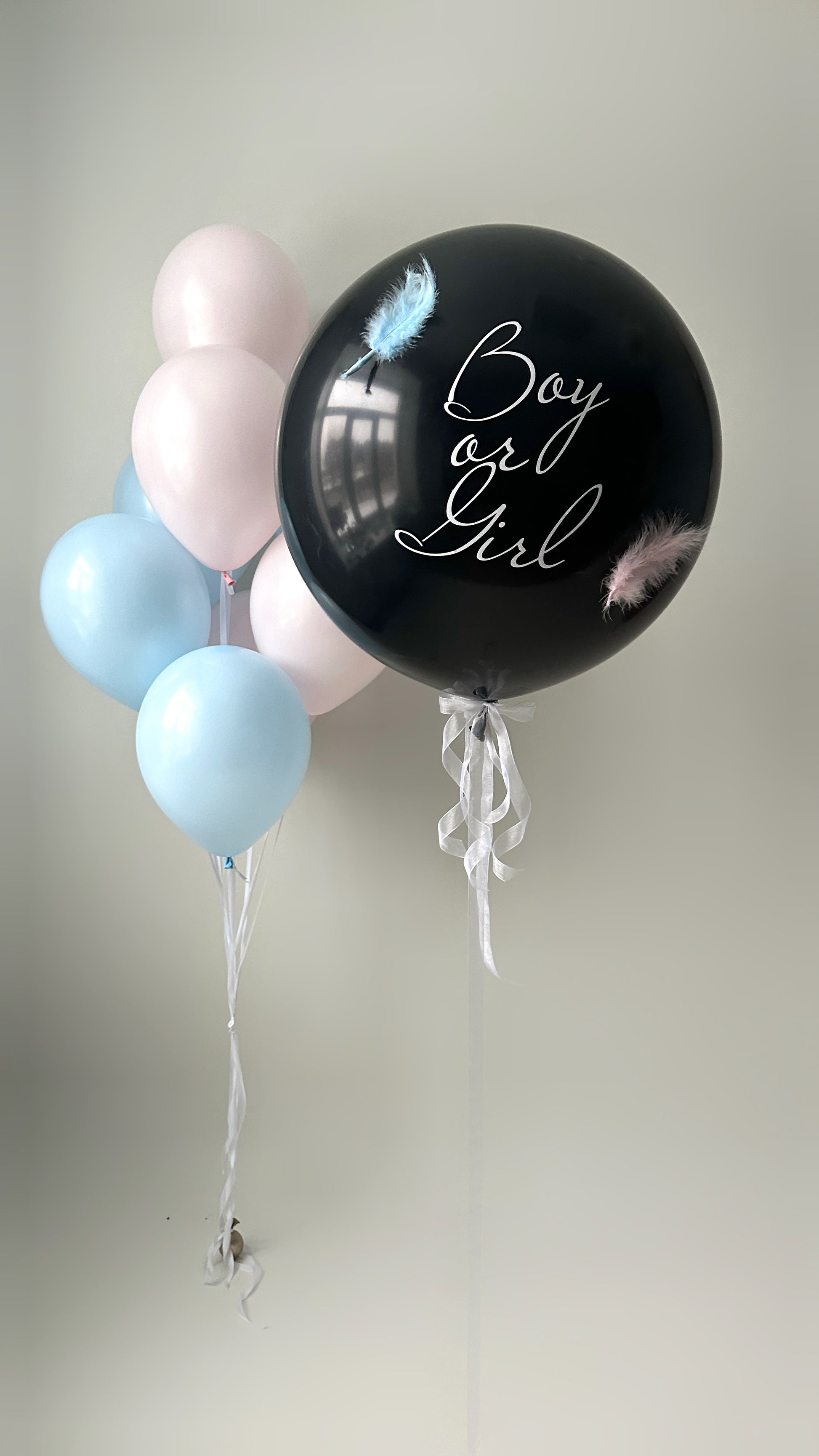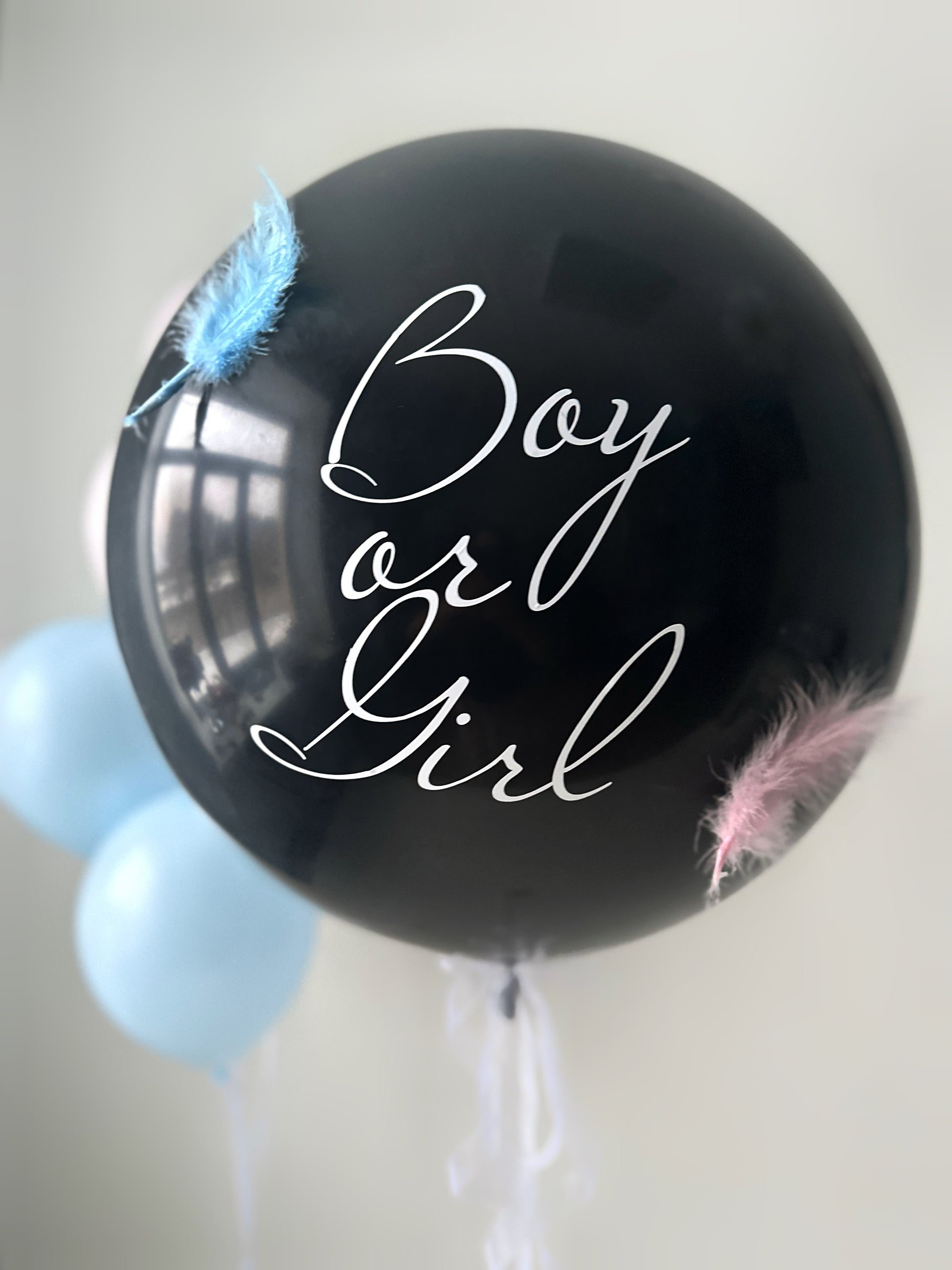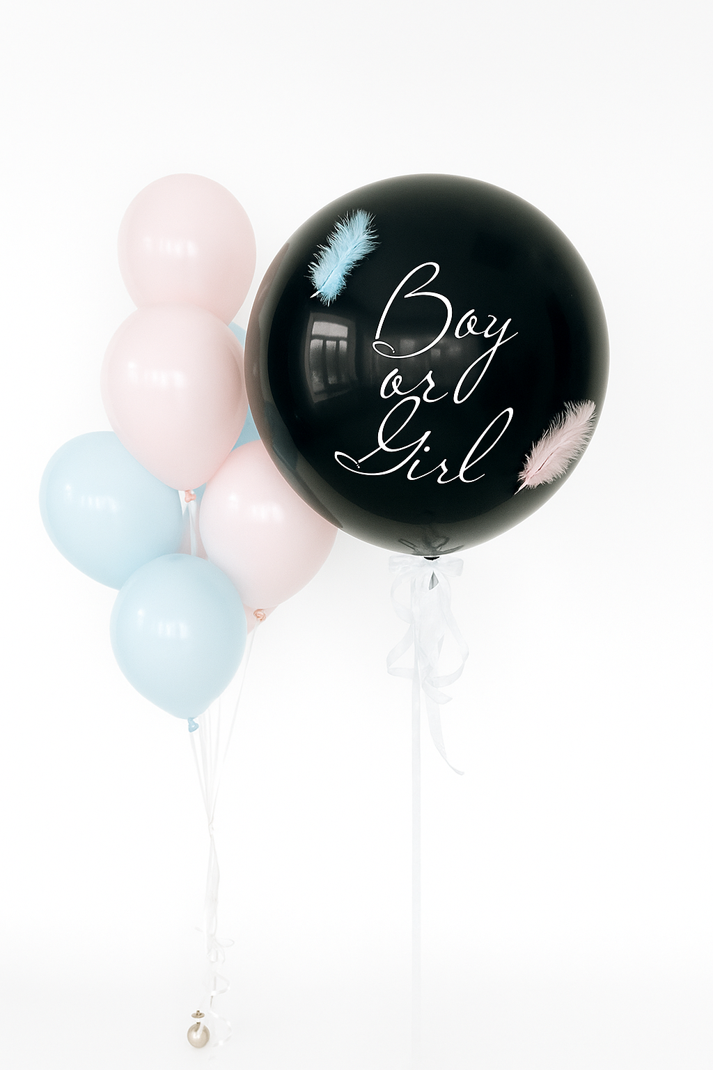 🎈 1 large black balloon with "Boy or Girl" inscription and soft feathers inside (can be filled with pink or blue confetti upon request)
