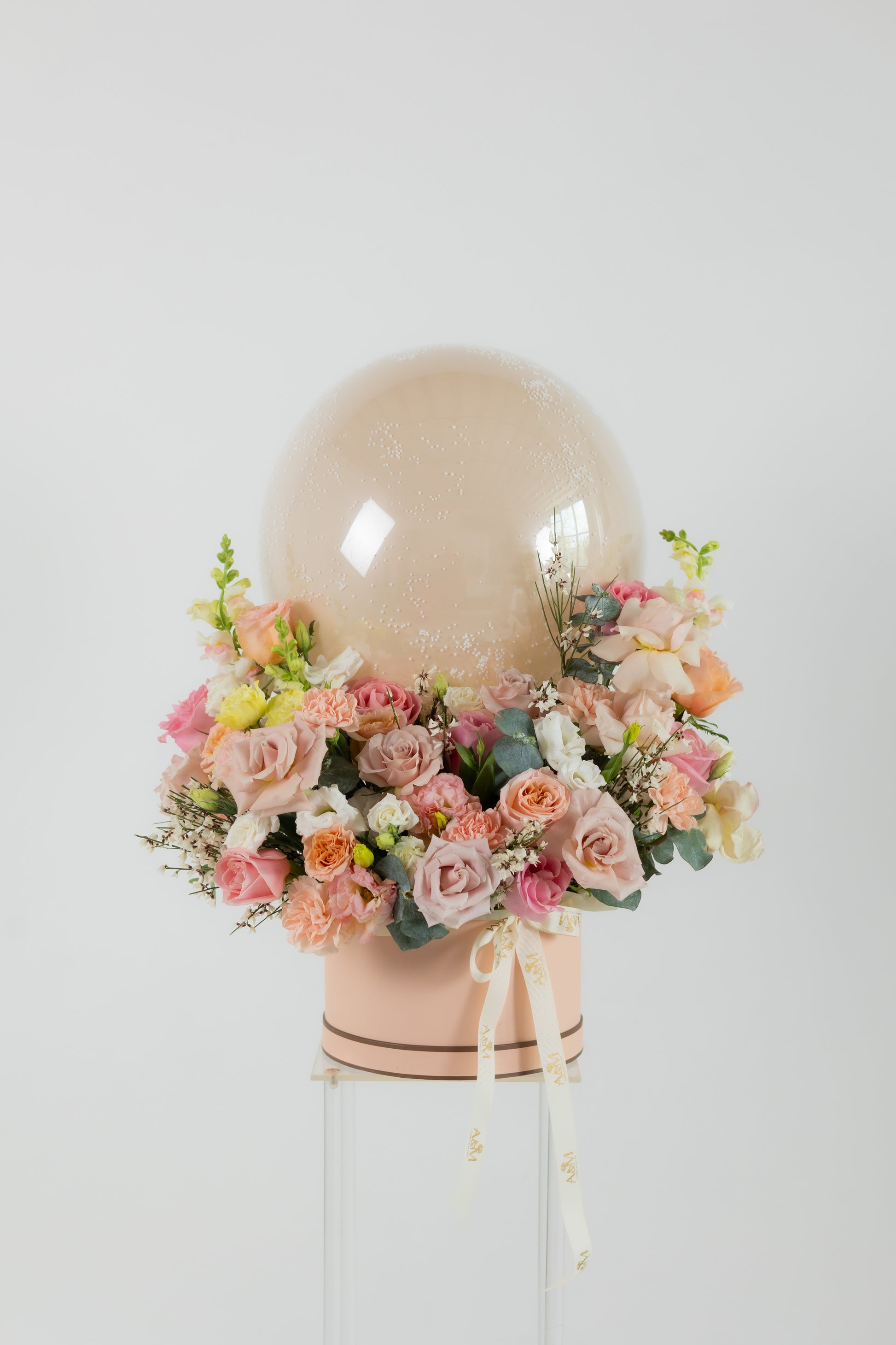 A stunning combination of fresh flowers arranged in a hatbox with a clear bubble balloon — perfect for birthdays, anniversaries, or any special occasion.