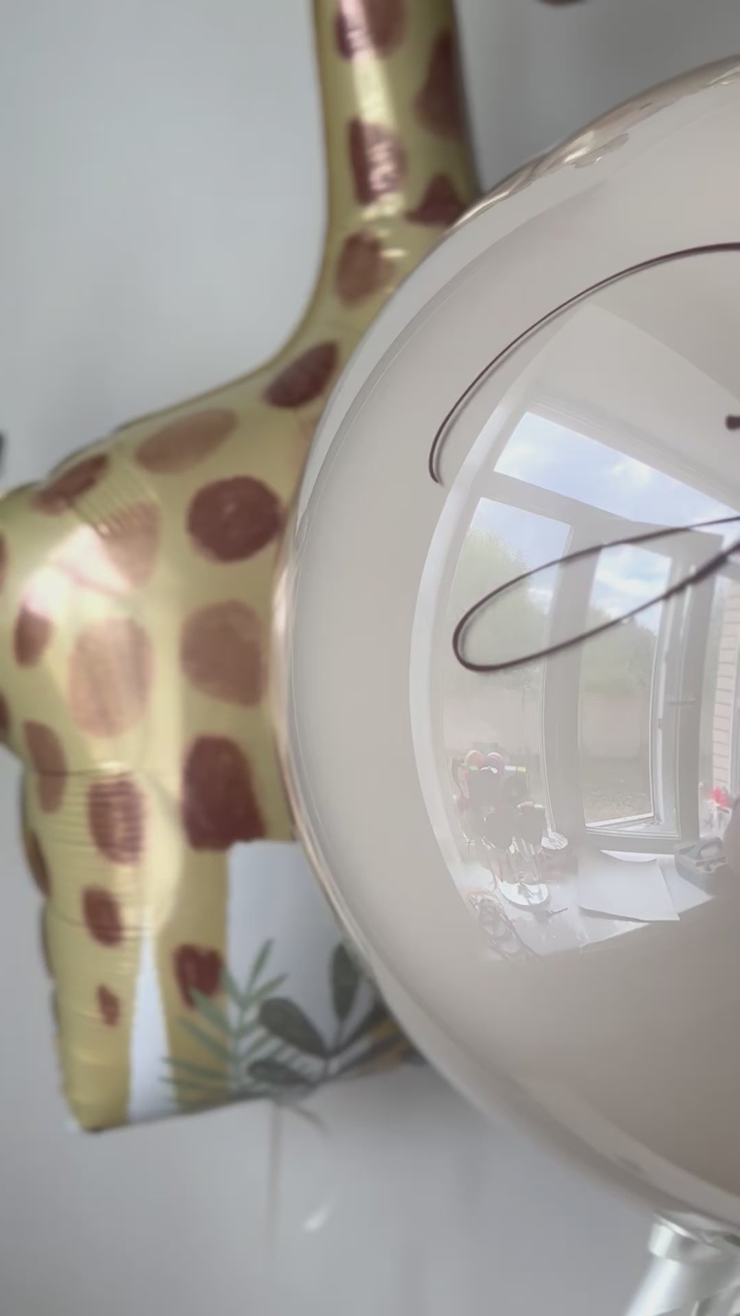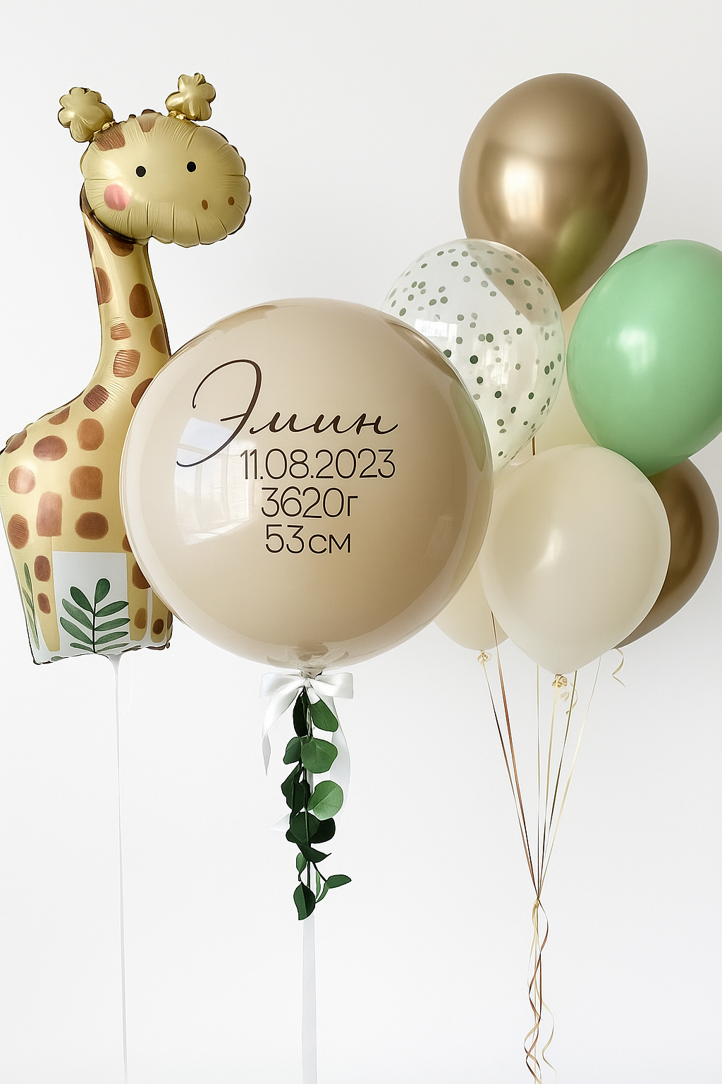 Designed in earthy greens, soft golds, and creamy neutrals, this set features a personalized bubble balloon with the baby’s name and birth stats, surrounded by matching latex balloons and a foil giraffe for extra charm.