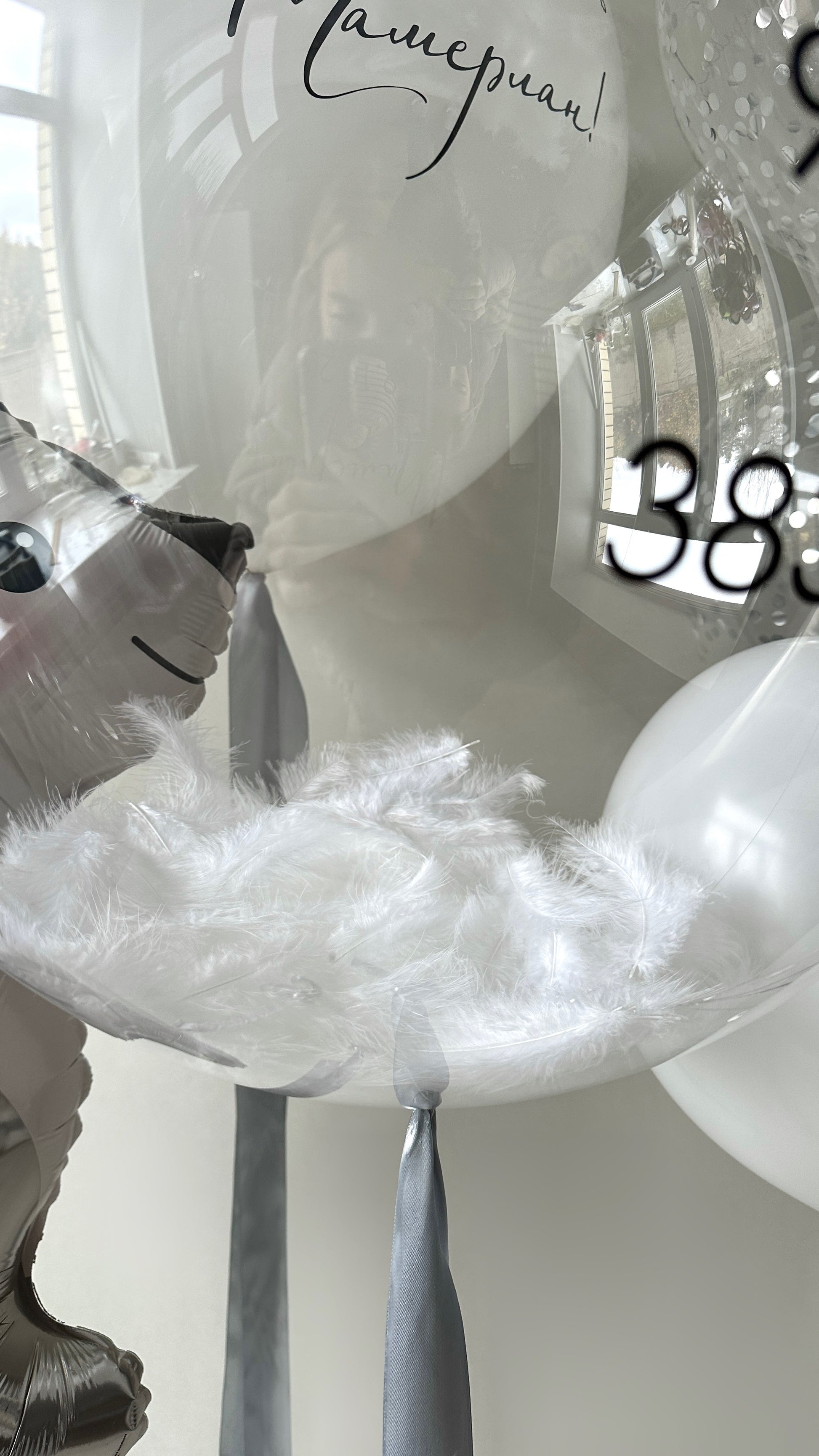 • 1 large clear bubble balloon with custom inscription and feathers