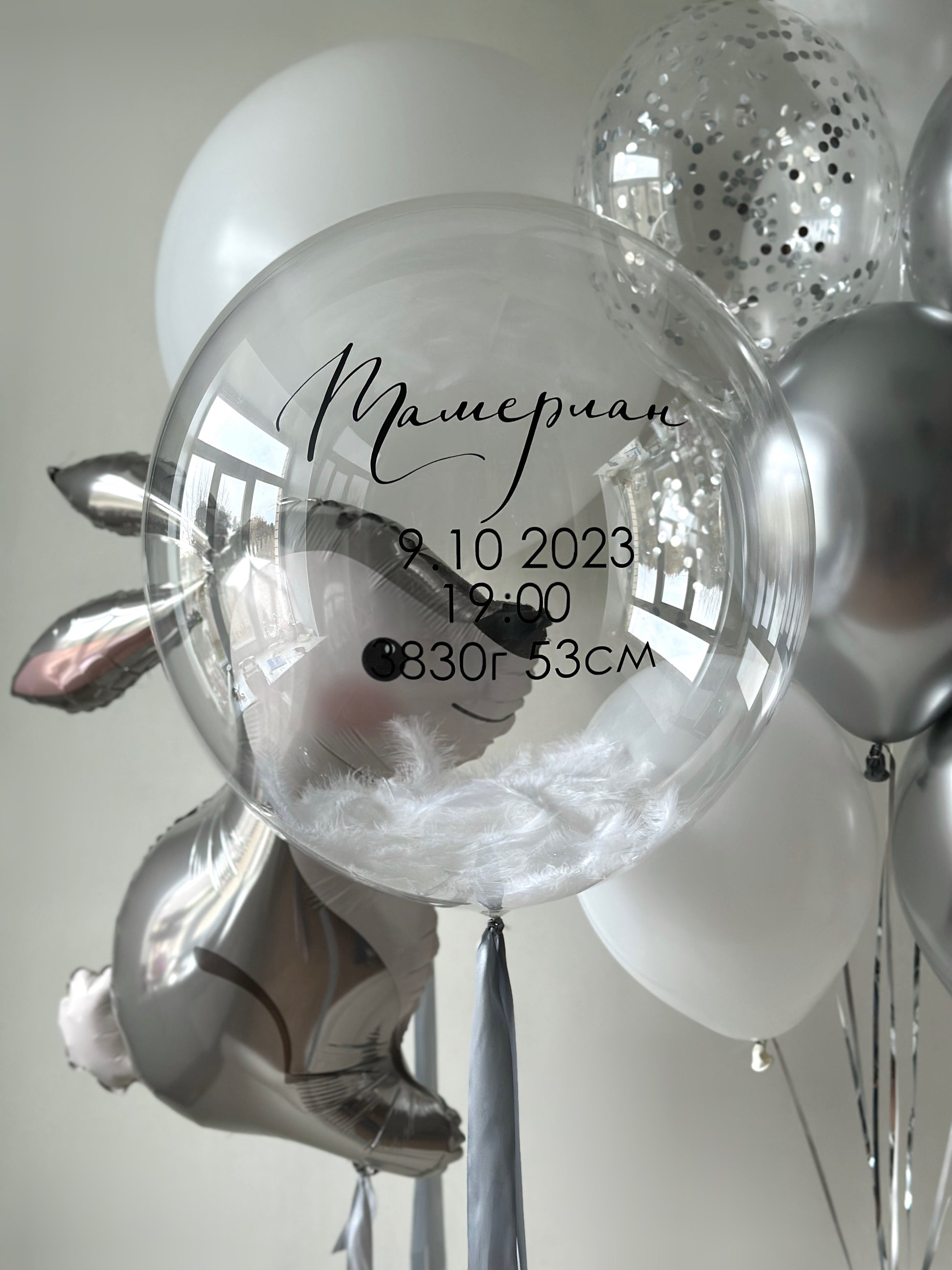 Celebrate a precious arrival with this soft and elegant balloon arrangement in white, silver, and chrome. The set features a personalized clear bubble balloon filled with feathers and baby stats, a cute bunny foil balloon, and a bundle of premium helium-filled latex and confetti balloons — perfect for newborn greetings, hospital pickup, or baby shower decor.