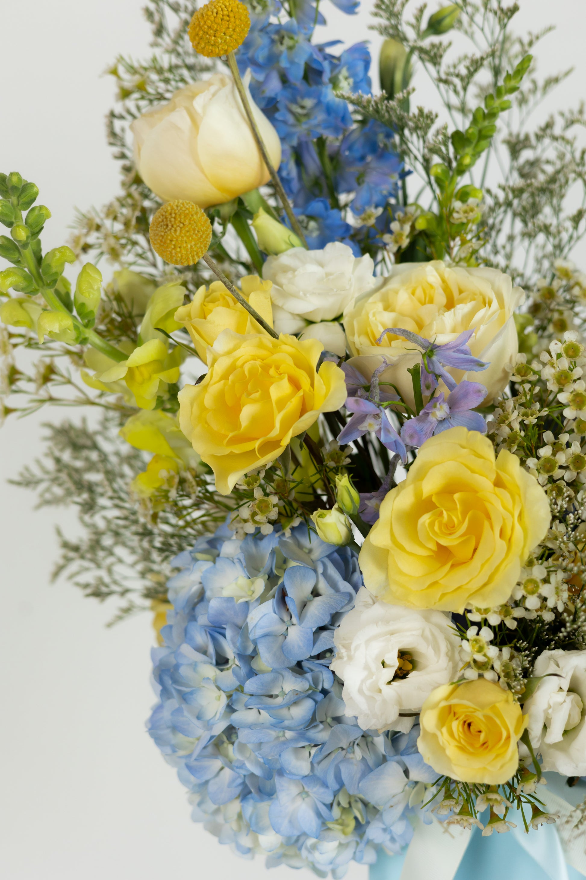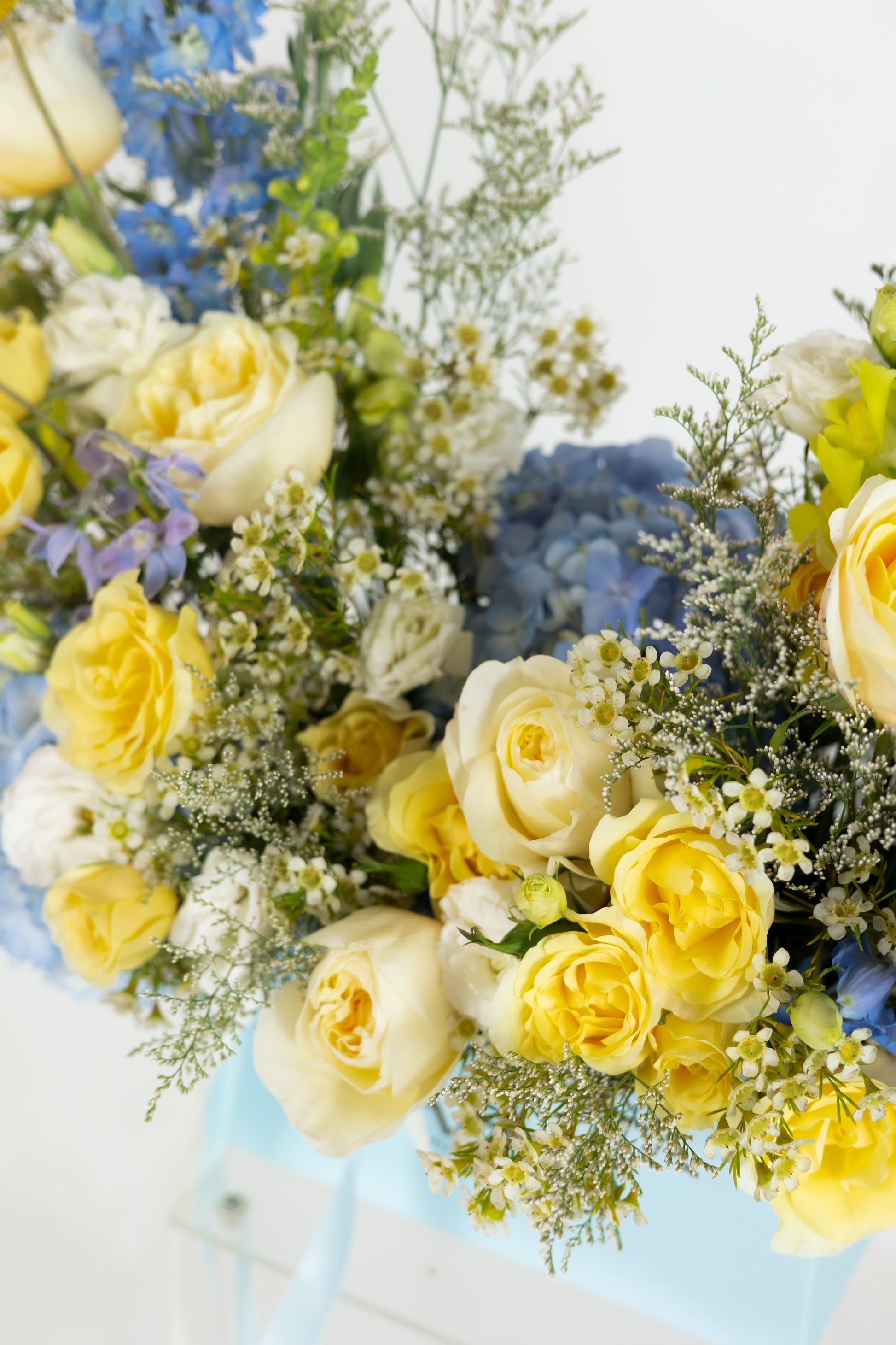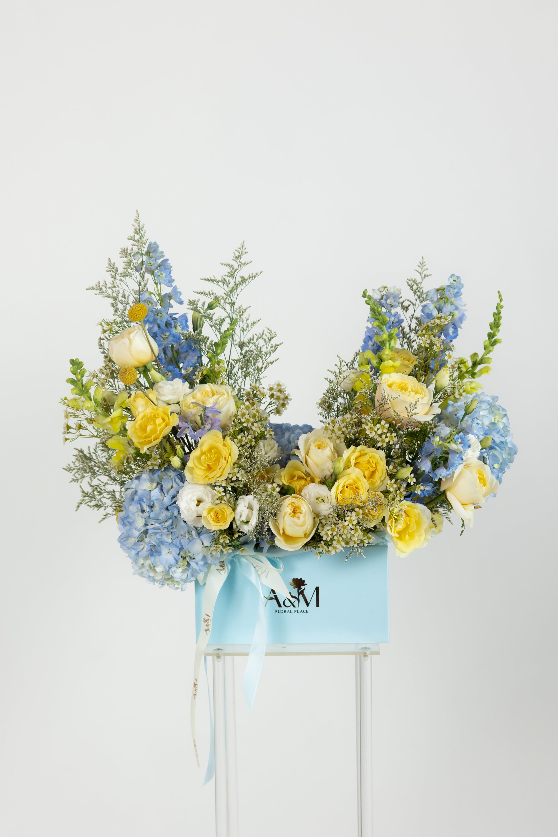 A joyful floral box that radiates light and warmth. Blue hydrangeas and delphiniums set a soft tone, while yellow snapdragons and craspedia add a cheerful pop. Fatima and spray roses bring elegance, complemented by white lisianthus, waxflowers, and soft greenery. A fresh and uplifting gift for any special moment.