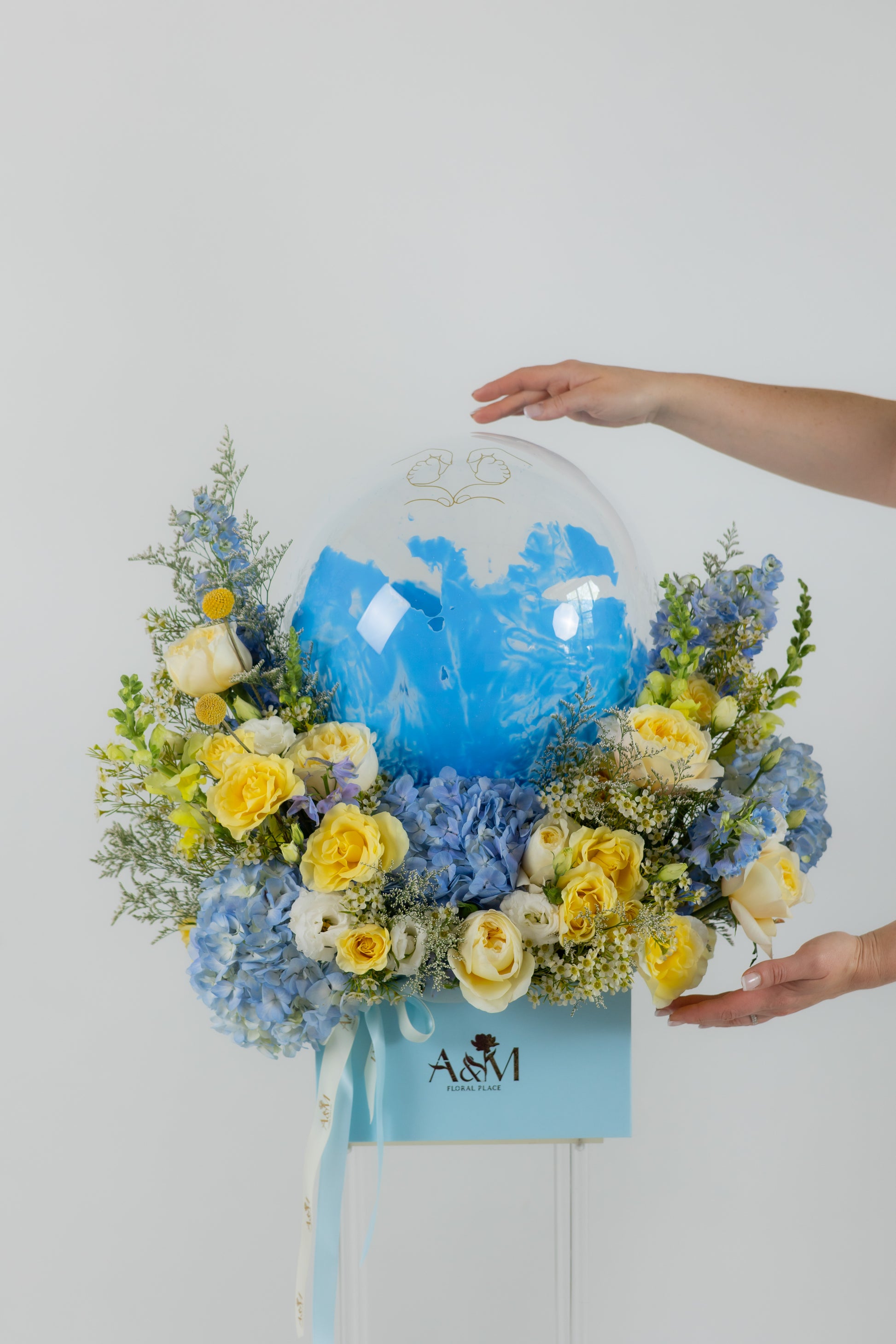 Bring joy, light, and color into someone’s day with our Sky Bloom Box — a vibrant floral arrangement that perfectly blends sunshine and serenity. Designed in a signature baby blue box with satin ribbon, this composition features: