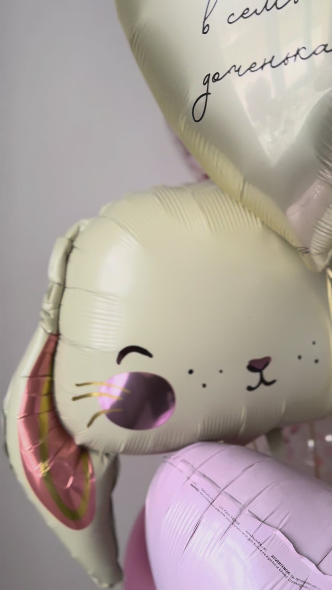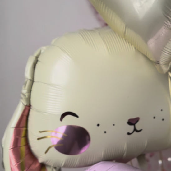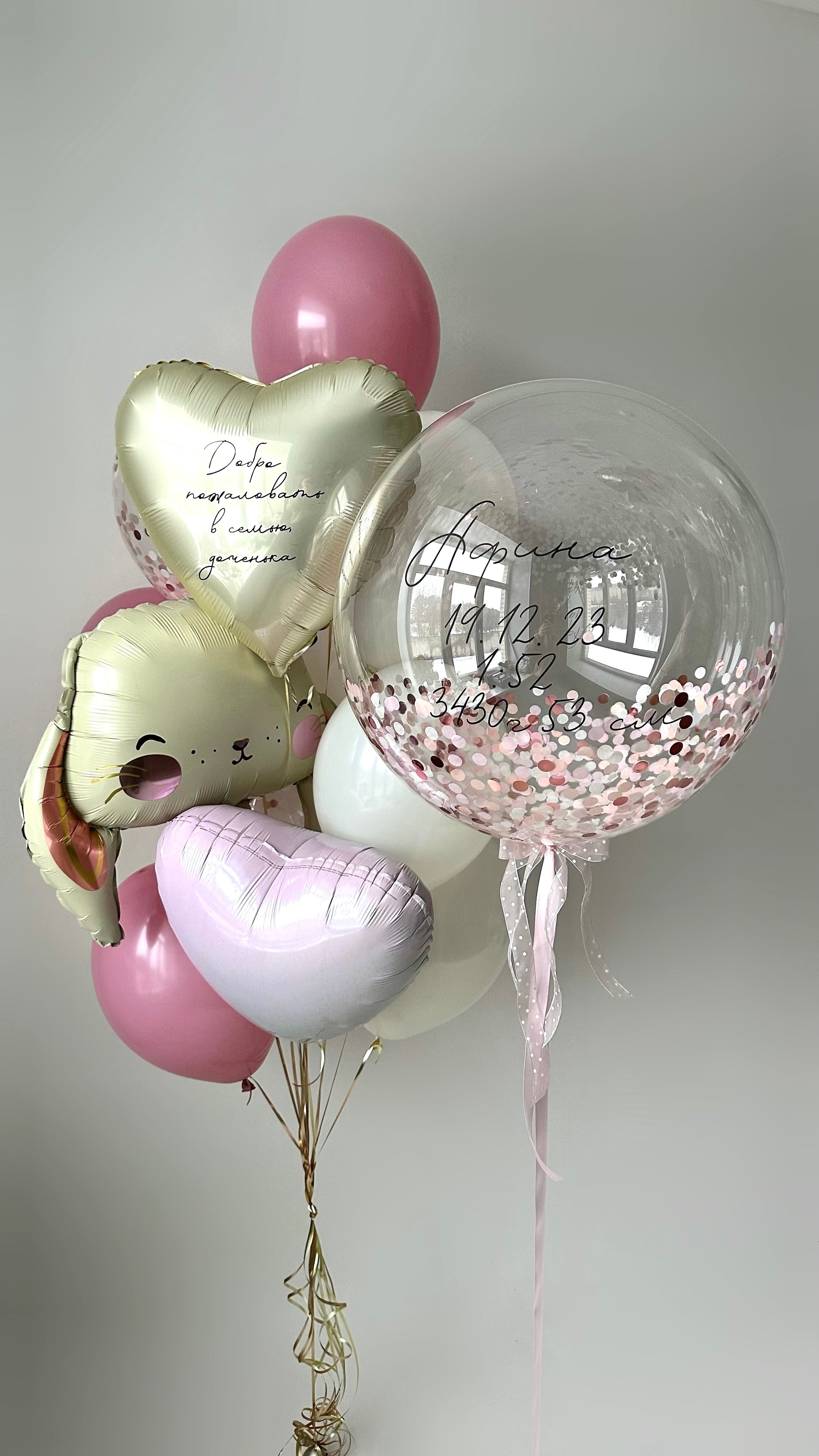 Celebrate the birth of a precious baby girl with this joyful balloon arrangement in soft blush and pastel tones. This set features a personalized clear bubble balloon with name and birth stats, adorable foil balloons (including a bunny and hearts), and matching latex balloons for a photo-ready look.