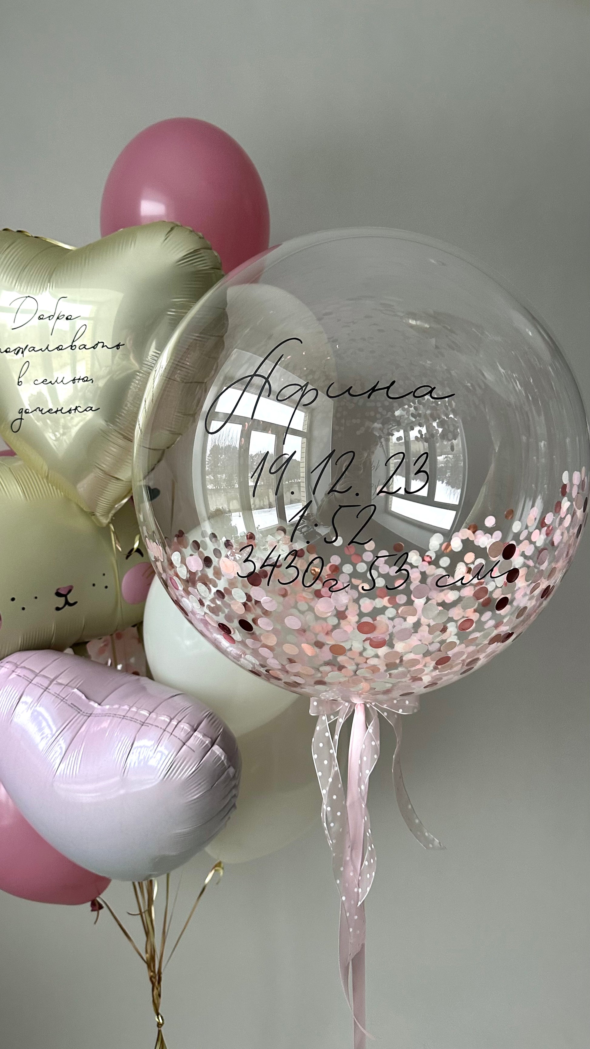 • 1 clear bubble balloon with personalized inscription & pink confetti