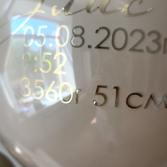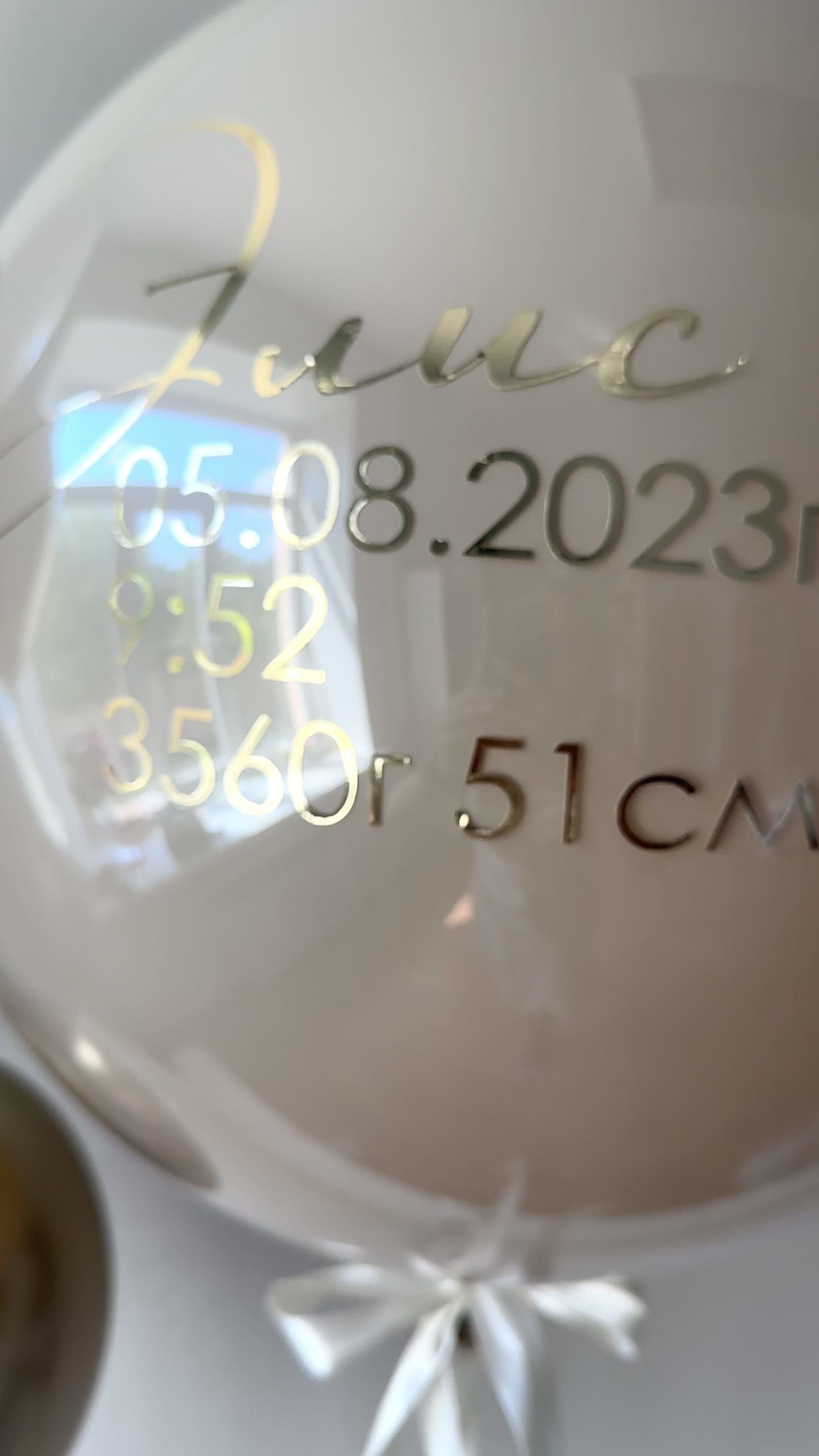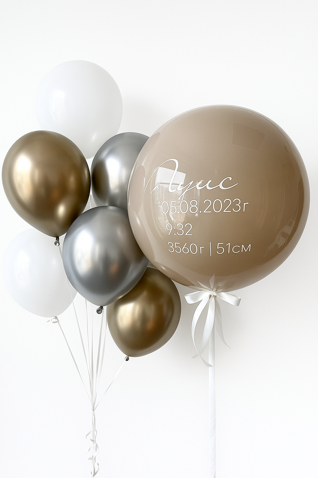 This neutral-toned set features a personalized clear bubble balloon with custom birth details — name, date, time, weight, and height — surrounded by glossy white, silver, and champagne gold latex balloons.